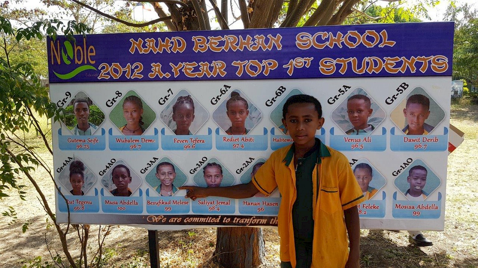 Glücklich zeigt Besufikad, ein Patenkind von 1 €uro International, auf sein Foto. Er hat die Klasse 3 als Klassenbester abgeschlossen.